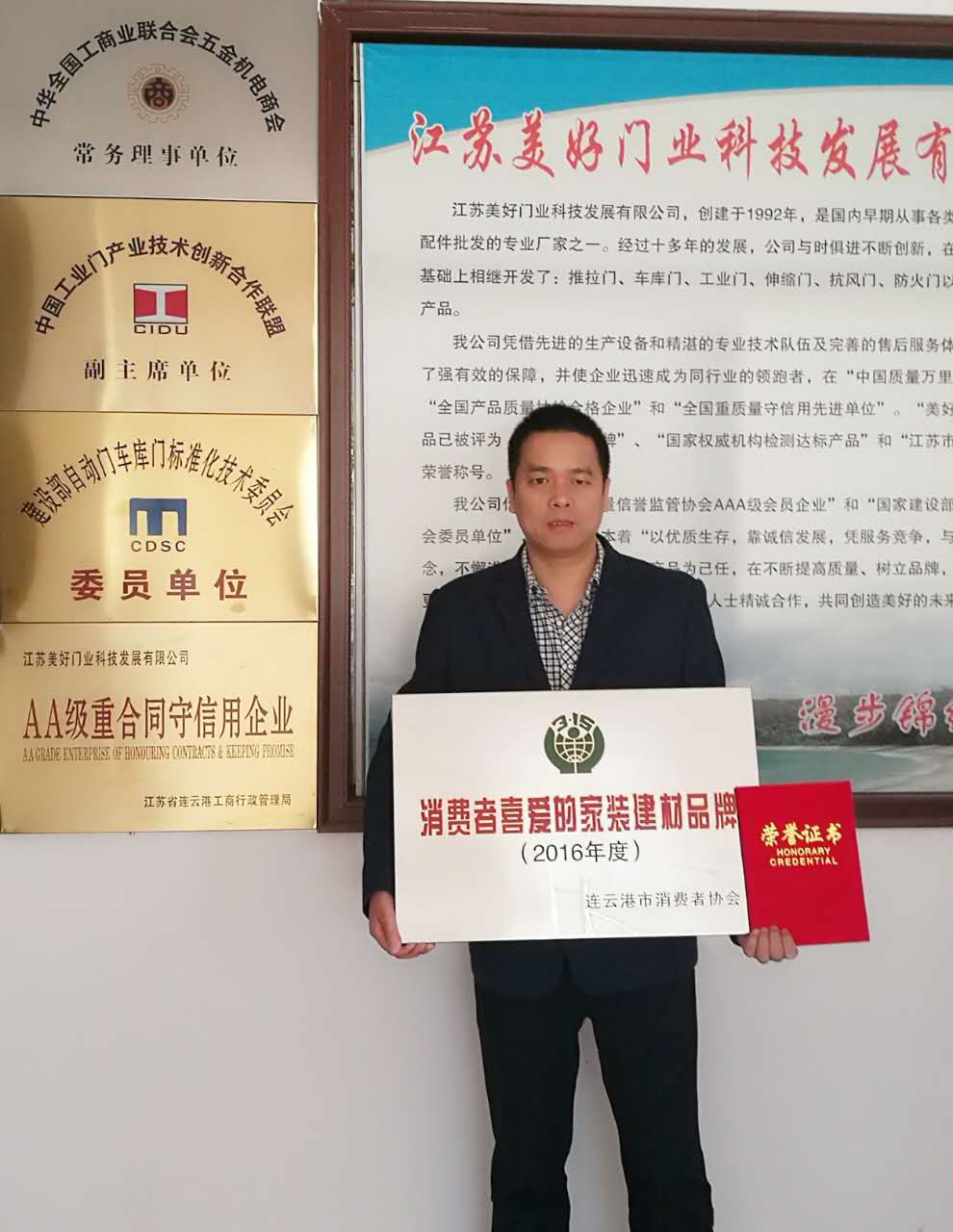 江蘇美好門業(yè)科技發(fā)展有限公司,在2016年度“家裝入萬家,消協(xié)伴您行”家裝建材評比活動(dòng)中,被連云港市消費(fèi)者協(xié)會授予“消費(fèi)者最喜歡的家裝建材品牌”榮譽(yù)稱號。