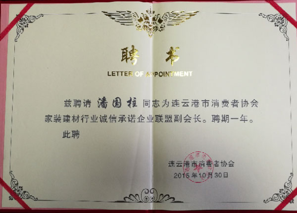 連云港市消費(fèi)者協(xié)會(huì)家裝建材行業(yè)聯(lián)盟副會(huì)長(zhǎng)