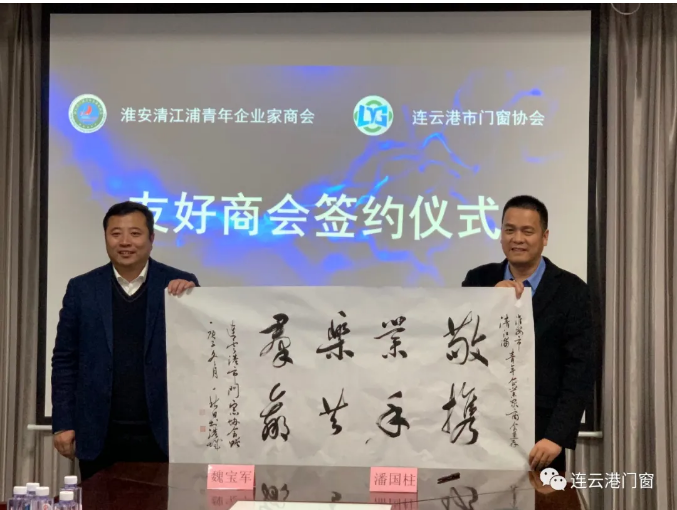 ? ? ? 連云港市門窗協(xié)會潘國柱會長和淮安清江浦青年企業(yè)家商會魏寶軍會長簽約友好協(xié)議。并互贈禮品。