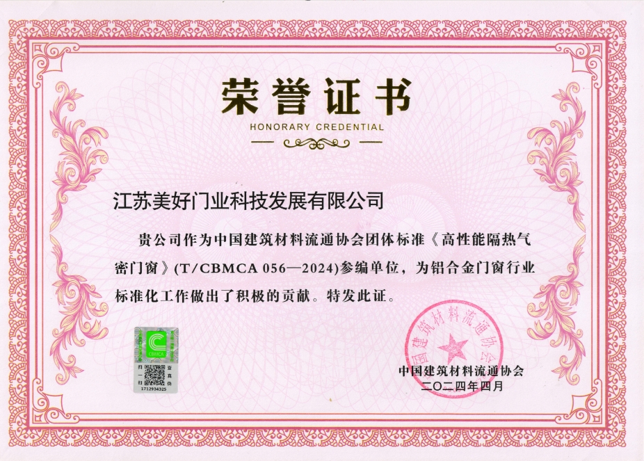 江蘇美好門業(yè)科技發(fā)展有限公司《 高性能隔熱氣密門窗》標(biāo)準(zhǔn)參編證書
