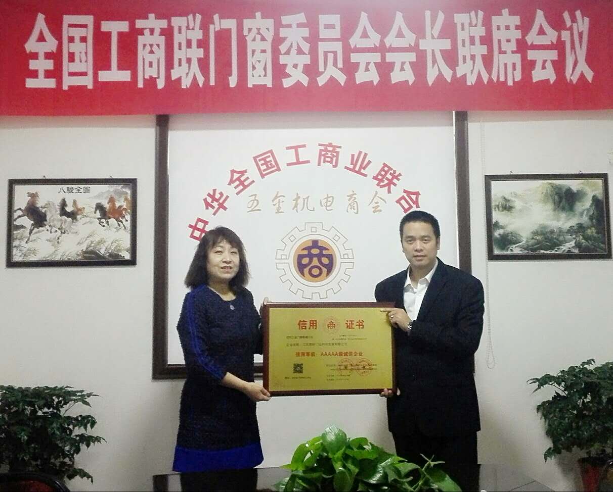 全國工商聯(lián)門窗委員會秘書長張秀梅女士為江蘇美好門業(yè)科技發(fā)展有限公司董事長潘國柱頒發(fā)“AAAAA級誠信企業(yè)”信用證書。
