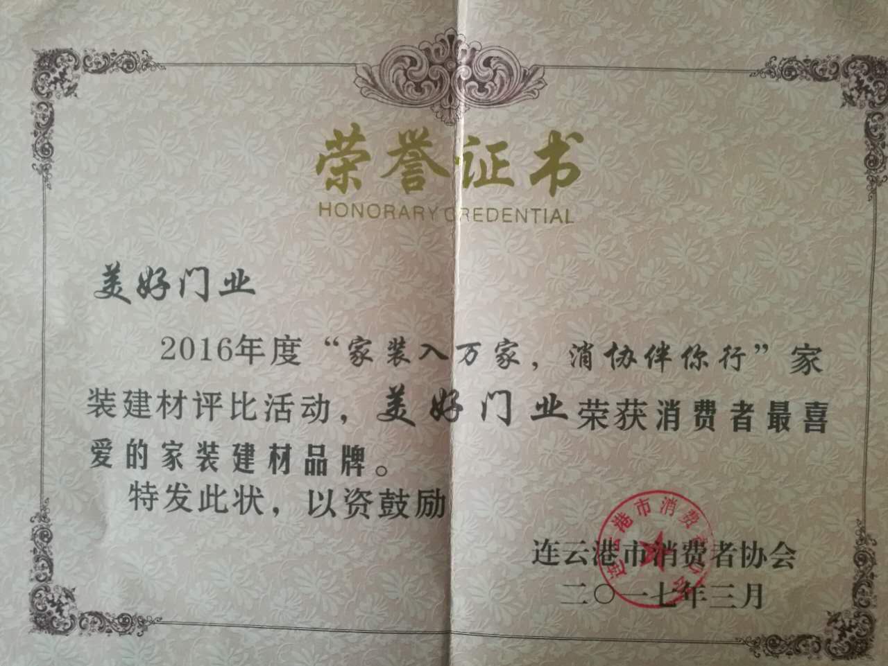 江蘇美好門業(yè)科技發(fā)展有限公司,在2016年度“家裝入萬家,消協(xié)伴您行”家裝建材評比活動(dòng)中,被連云港市消費(fèi)者協(xié)會授予“消費(fèi)者最喜歡的家裝建材品牌”榮譽(yù)稱號。