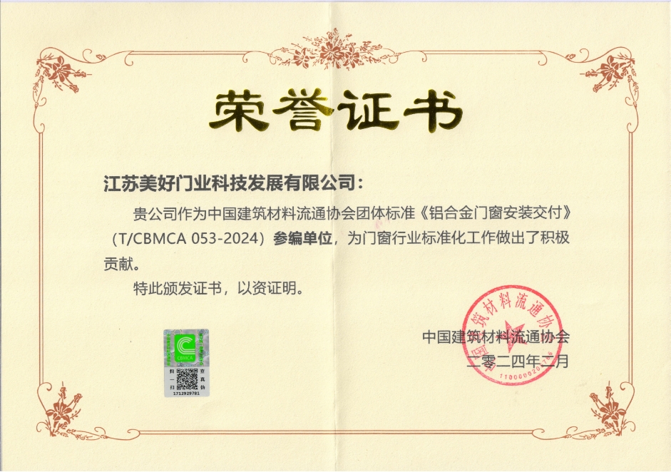 江蘇美好門業(yè)科技發(fā)展有限公司《鋁合金門窗安裝交付》標(biāo)準(zhǔn)參編證書